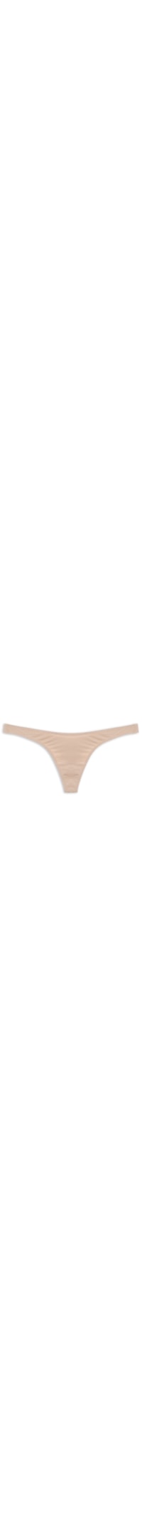 A calcinha bege é confeccionada em malha de poliamida. A peça de modelo fio dental possui laterais médias, forro de algodão e acabamento pespontado.