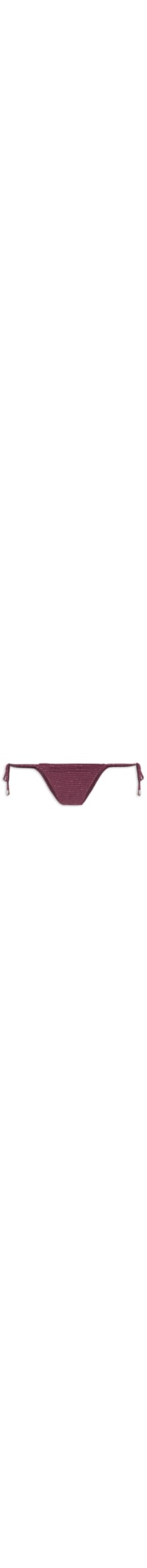 A calcinha vinho é confeccionada em malha de poliamida com fios em lurex. A peça de modelo tanga possui tiras finas de amarração com ponteiras metálicas, detalhe de franzidos na parte posterior, forro, acabamento pespontado e fechamento lateral por amarração.