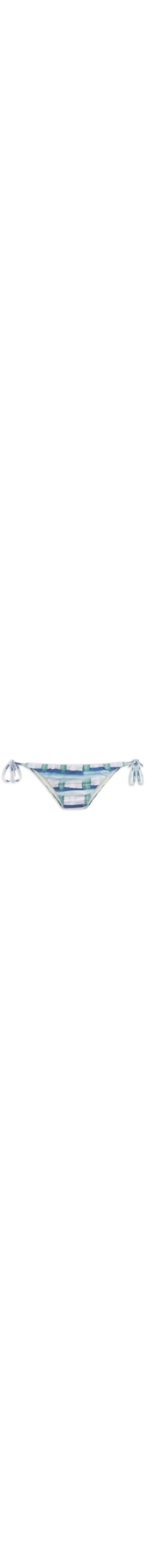 A calcinha azul é confeccionada em malha de poliamida. A peça de modelo tanga possui laterais finas com tiras para amarração, estampa abstrata em cores contrastantes, forro e acabamento com elástico.