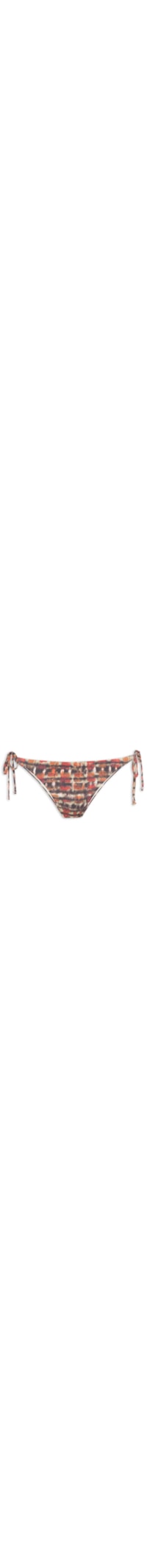A calcinha laranja é confeccionada em malha de poliamida. A peça de modelo tanga possui laterais finas com tiras para amarração, estampa abstrata em cores contrastantes, forro e acabamento pespontado.