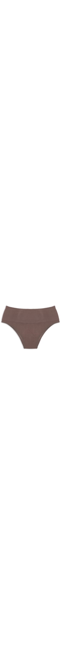 A calcinha marrom é confeccionada em tecido leve com média elasticidade. A peça possui cintura alta, cós amplo elástico e laterais largas.