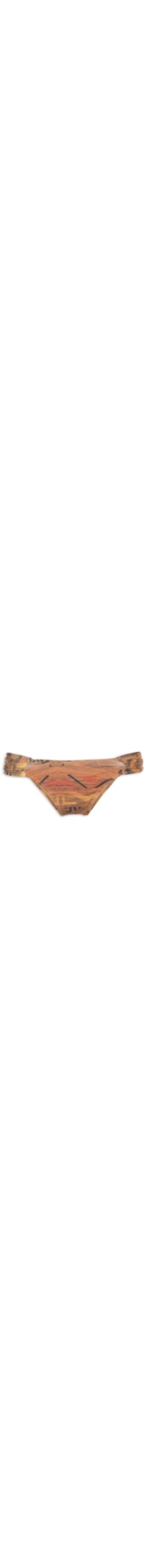 A calcinha marrom é confeccionada em malha de poliamida. A peça de modelo tanga possui laterais médias franzidas, estampa abstrata em cores contrastantes, forro e acabamento pespontado.