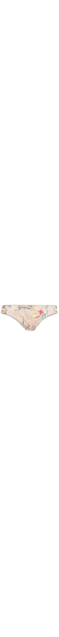 A calcinha bege é confeccionada em malha de poliamida. A peça de modelo tanga possui laterais com tiras duplas e recorte vazado, mix de estampas em cores contrastantes, forro e acabamento pespontado.