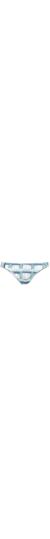 A calcinha azul é confeccionada em malha de poliamida. A peça de modelo tanga possui laterais médias com elástico embutido, estampa abstrata em cores contrastantes, forro aplicado e acabamento pespontado.