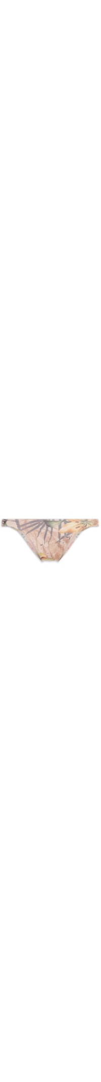 A calcinha bege é confeccionada em malha de poliamida. A peça de modelo tanga possui laterais médias com aplicação de elástico e detalhe franzido, mix de estampa em cores contrastantes, forro e acabamento pespontado.