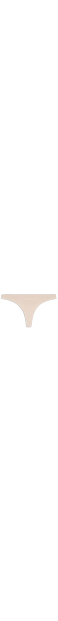 A calcinha bege é confeccionada em malha de poliamida. A peça de modelo fio dental possui cintura baixa, cós aplicado, shape justo, laterais finas e acabamento elástico.