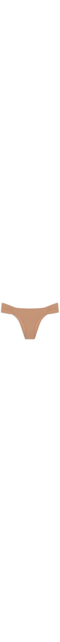 A calcinha bege é confeccionada em malha leve com média elasticidade. A peça possui cós liso com acabamento em costura rebatida, laterais médias com detalhe franzido e forro.
