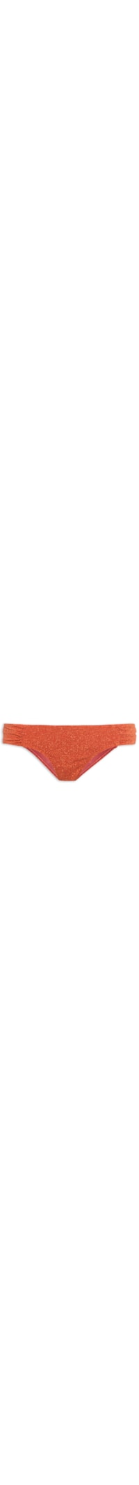 A calcinha laranja é confeccionada em malha com superfície texturizada. A peça de modelo tanga possui laterais largas com drapeado e forro.