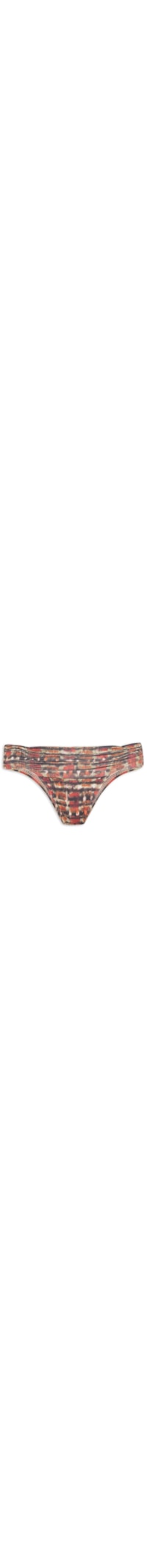 A calcinha laranja é confeccionada em malha de poliamida. A peça de modelo tanga possui laterais médias, cós com detalhe de pregas, estampa abstrata em cores contrastantes, forro e acabamento pespontado.