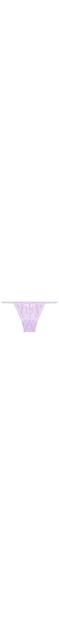 A calcinha lilás é confeccionada em renda com alta elasticidade. A peça de modelo string possui laterais finas reguláveis, recorte posterior e frontal, forro e transparência.