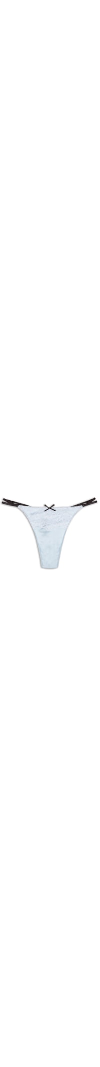 A calcinha azul é confeccionada em cetim com média elasticidade. A peça de modelo string possui laterais finas reguláveis, renda sobreposta a parte frontal com detalhe de laço na cor preta, parte posterior em renda com transparência e forro em algodão.