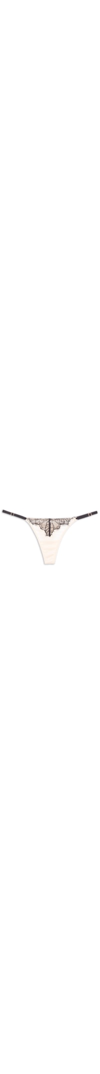 A calcinha preta é confeccionada em malha de algodão com média elasticidade. A peça de modelo string possui cintura baixa, laterais finas reguláveis, parte posterior modelo fio dental, recortes em renda e forro.