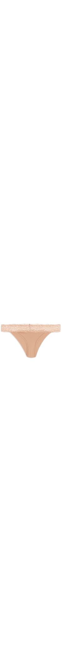 A calcinha bege é confeccionada em malha com alta elasticidade. A peça de modelo tanga possui laterais médias, parte superior em renda com transparência, recorte posterior, forro e tag da marca aplicada em metal na parte posterior.