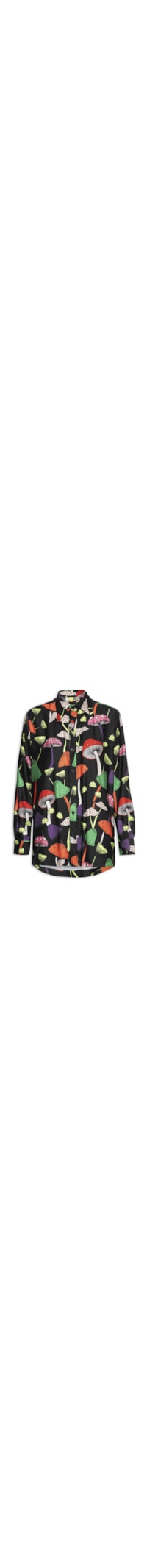 A camisa preta é confeccionada em tecido leve sem elasticidade. A peça solta ao corpo com colarinho clássico, mangas longas com detalhe franzido e abotoabento no punho, recorte posterior, comprimento longo, barra arredondada, fechamento frontal por botões.