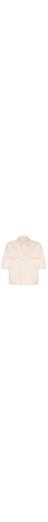 A camisa bege é confeccionada em tecido leve com superfície texturizada e sem elasticidade. A peça solta ao corpo possui colarinho clássico, mangas curtas, bolsos frontais com vistas sobrepostas, ombros estendidos, recorte posterior com pregas, comprimento cropped* e fechamento frontal por botões.