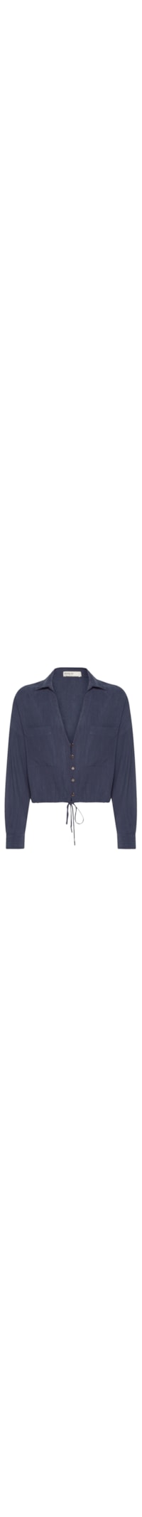 A camisa azul marinho é confeccionada em tecido leve sem elasticidade. A peça solta ao corpo possui colarinho simples, decote tesoura, ombros estendidos, mangas longas com abotoamento nos punhos, amarração frontal, barra mullet* com cordão embutido para amarração frontal e fechamento por botões na frontal.