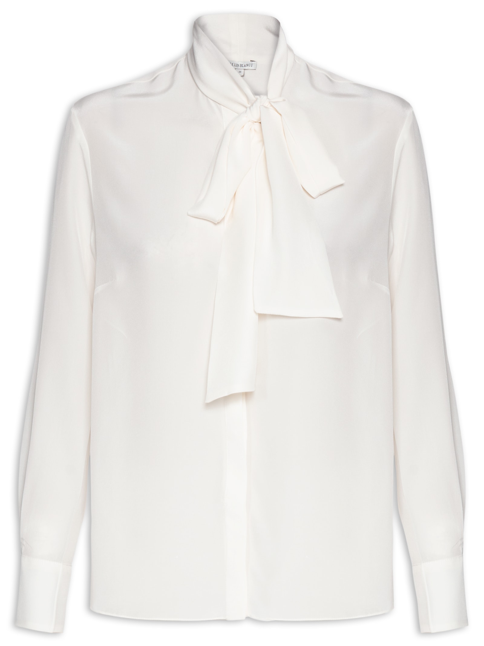 A camisa branca é confeccionada em seda sem elasticidade. A peça solta ao corpo possui possui gola alta com faixa alongada embutida para amarração, mangas longas com abotoamento nos punhos, pregas posteriores e fechamento frontal por botões com vista sobreposta.