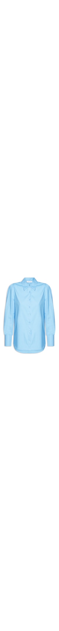 A camisa azul é confeccionada em tecido leve sem elasticidade. A peça solta ao corpo, possui colarinho clássico, mangas longas com punho largo e abotoamento, ombros franzidos, barra mullet* arredondada e fechamento frontal por botões.