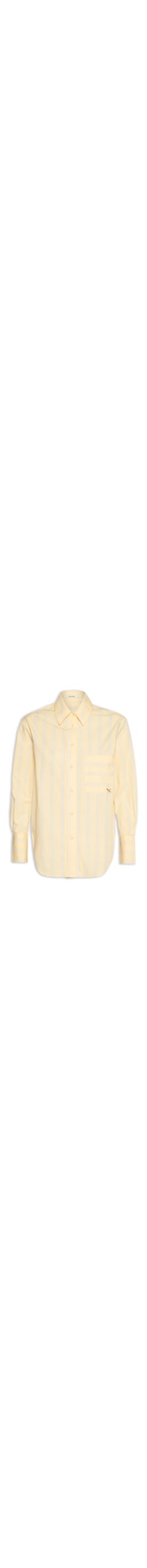 A camisa off white é confeccionada por tecido leve sem elasticidade. A peça solta ao corpo possui colarinho clássico, mangas longas com ajuste nos punhos, bolso frontal, padronagem de listras em cores contrastantes e fechamento frontal por botões.