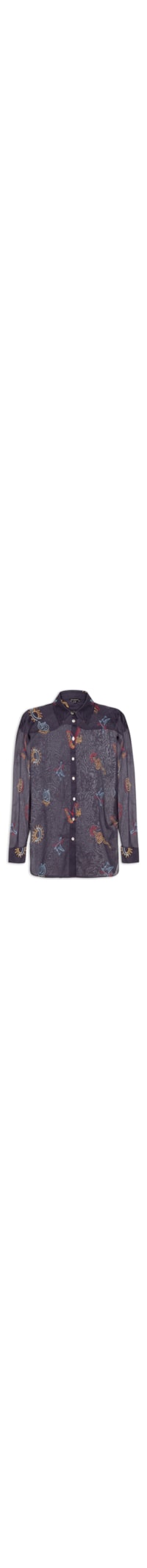 A camisa azul marinho é confeccionada em tecido leve sem elasticidade. A peça solta ao corpo possui colarinho clássico, mangas longas com ajuste nos punhos, bordados figurativos aplicados em cores contrastantes e fechamento frontal por botões.