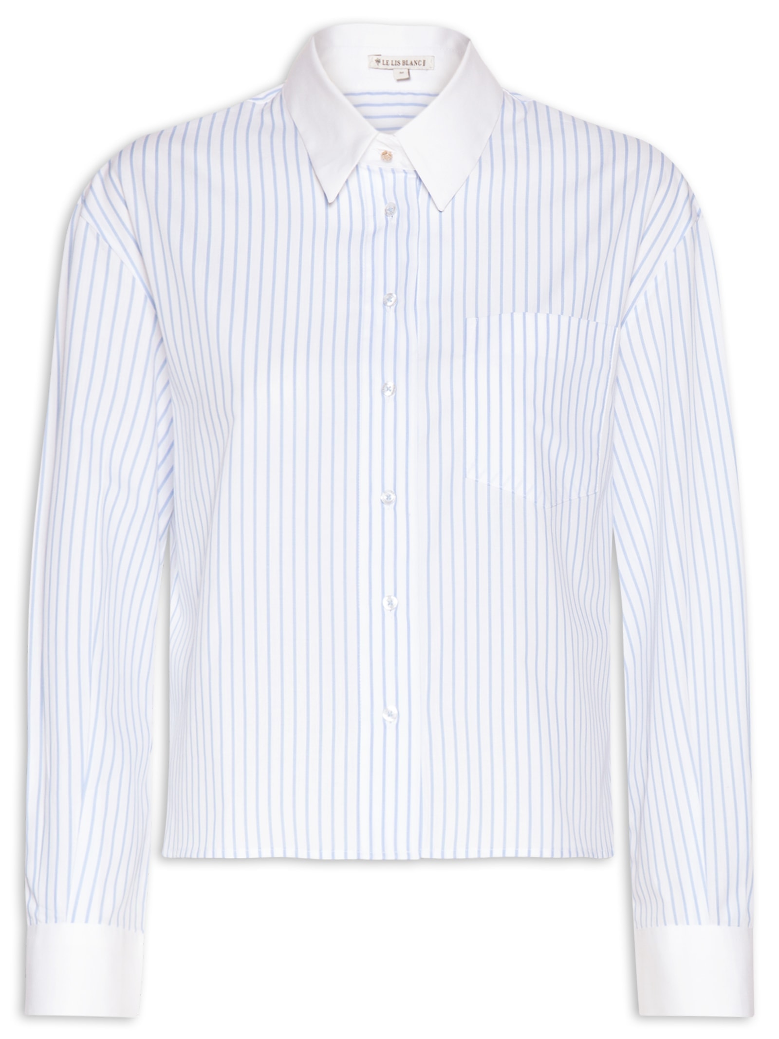A camisa azul é confeccionada em tecido leve sem elasticidade. A peça solta ao corpo possui colarinho clássico, mangas longas com abotoamento e pregas nos punhos, recorte posterior com prega, logo da marca aplicado em metal na parte posterior, padronagem listrada na cor branca, ombros estendidos, bolso na altura do busto, punhos e gola na cor branca, barra mullet* e fechamento frontal por botões.
