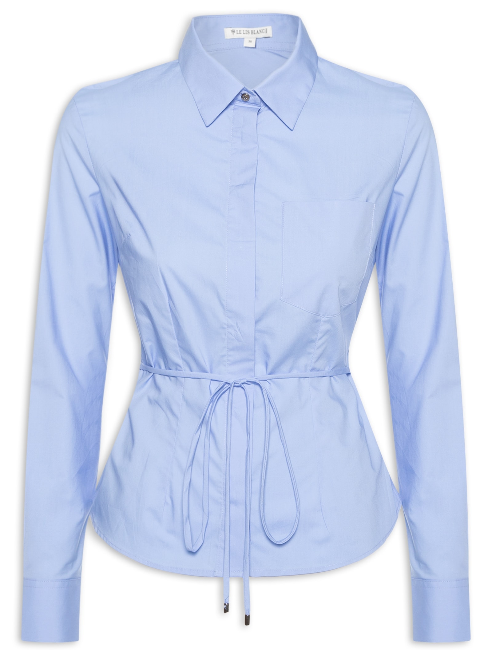A camisa azul é confeccionada em tecido leve sem elasticidade. A peça solta ao corpo possui colarinho clássico, mangas longas com abotoamento nos punhos, pences frontais, bolso frontal na altura do busto, recorte posterior vazado com detalhe de transpasse e elástico embutido, tira alongada embutida na altura da cintura para amarração frontal, barra arredondada e fechamento frontal por botões com vista sobreposta.