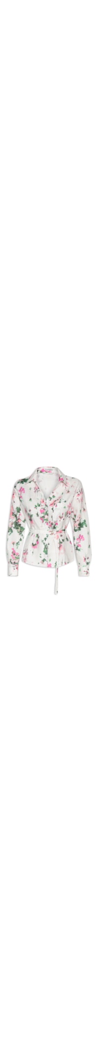 A camisa branca é confeccionada em linho sem elasticidade. A peça solta ao corpo possui colarinho clássico, mangas longas com ajuste nos punhos, tag da marca em metal aplicada na parte posterior, estampa abstrata em cores contrastantes, bolso na altura do busto, e fechamento frontal por botões com aba sobreposta. Acompanha cinto da mesma cor e tecido para uso opcional.
