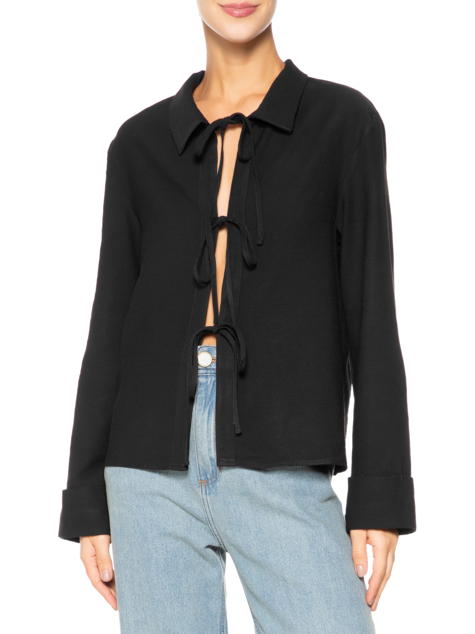 A camisa preta é confeccionada em tecido leve com toque de linho e baixa elasticidade. A peça solta ao corpo possui colarinho clássico, mangas longas com barra italiana, cordões alongados na parte frontal e fechamento frontal por amarração.
