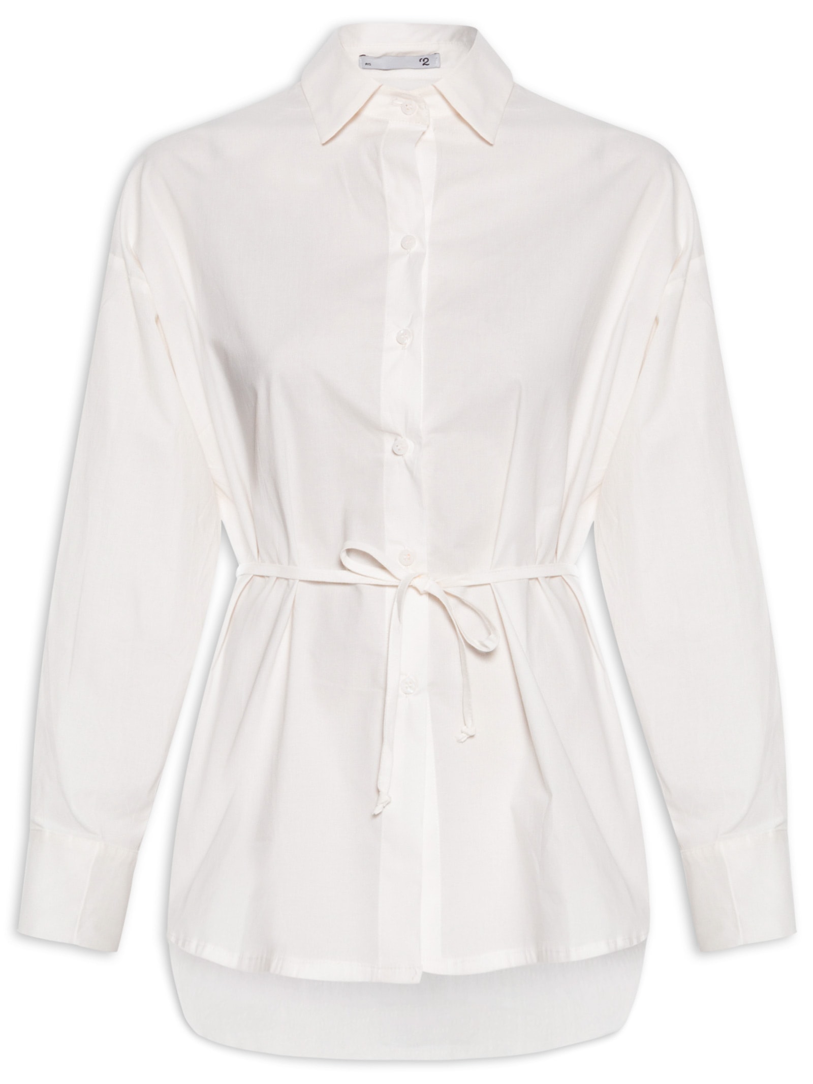 A camisa off white é confeccionada em tecido leve sem elasticidade. A peça solta ao corpo possui colarinho clássico, mangas longas com abotoamento nos punhos, comprimento alongado, faixas alongadas embutidas na altura da cintura para amarração frontal e fechamento frontal por botões.