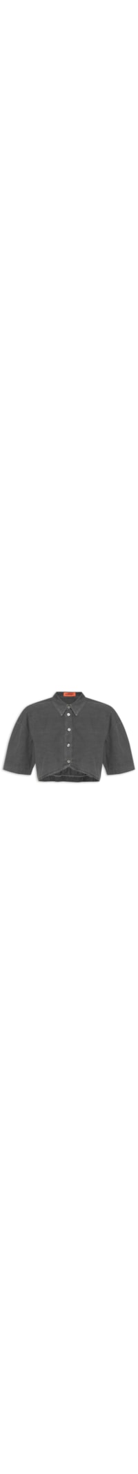 A camisa cinza é confeccionada em tecido leve. A peça possui colarinho francês, mangas curtas, tag metalizada da marca na altura das costas, barra assimétrica com elástico embutido na parte posterior, comprimento cropped* shape solto, caimento reto, acabamento pespontado e fechamento frontal por botões.
