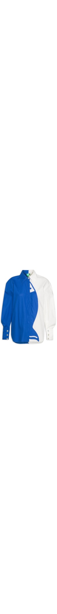 A camisa azul é confeccionada em tecido leve sem elasticidade. A peça solta ao corpo possui colarinho simples, mangas longas bufantes com recortes posteriores, pregas e abotoamento nos punhos, ombros estendidos, recorte posterior com prega, recorte off white, barra arredondada, comprimento alongado e fechamento frontal por botões com vista sobreposta.