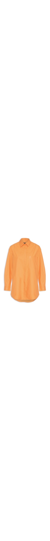 A camisa laranja é confeccionada em tecido leve sem elasticidade. A peça solta ao corpo possui colarinho francês, ombros estendidos, mangas longas com detalhes de pregas e abotoamento nos punhos, bolso frontal aplicado na altura do tórax, recorte posterior com detalhe de prega, barra arredondada, comprimento alongado e fechamento frontal por botões.