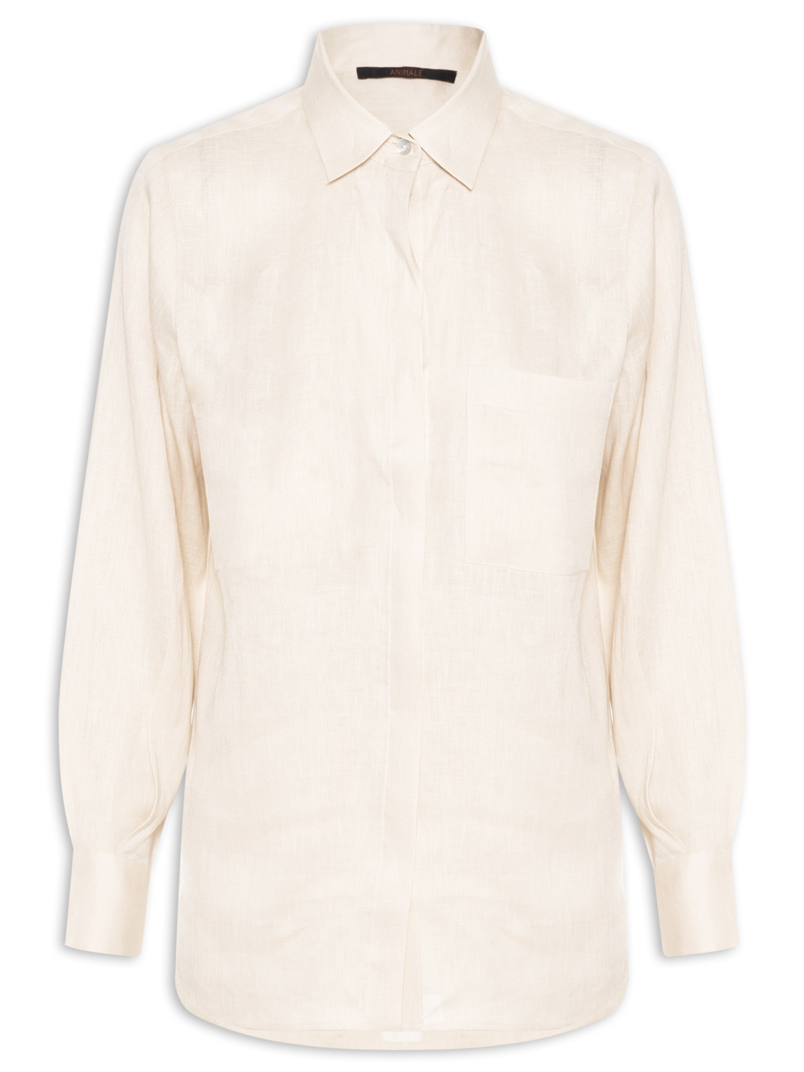 A camisa bege é confeccionada em linho sem elasticidade. A peça solta ao corpo, possui colarinho clássico, ombros estendidos, mangas longas com abotoamento nos punhos, bolso frontal na altura do busto, fendas laterais, recorte posterior com pregas, barra mullet* e fechamento frontal por botões com vista sobreposta.