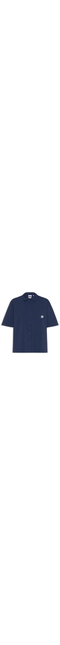 A camisa azul marinho é confeccionada em tecido leve sem elasticidade. A peça solta ao corpo possui colarinho clássico, mangas curtas, ombros estendidos, recortes posteriores, nome e logo da marca aplicados na parte frontal e fechamento frontal por botões.