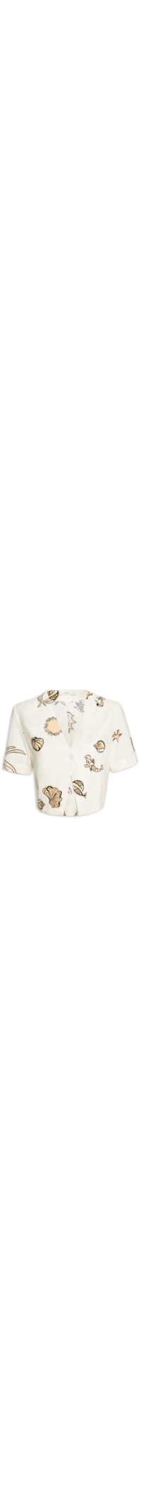 A camisa bege é confeccionada em tecido leve com toque de linho sem elasticidade. A peça solta ao corpo possui decote V, mangas curtas, recorte posterior, mix de estampas nas cores preto e laranja, detalhe de transpasse na parte frontal, forro, comprimento cropped* e fechamento frontal por botão forrado.