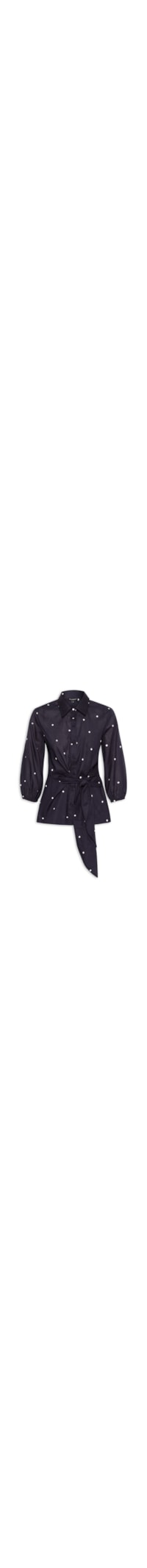 A camisa azul é confeccionada em tecido leve sem elasticidade. A peça solta ao corpo possui colarinho clássico, mangas 3/4 amplas com ajuste nos punhos, recortes posteriores, tiras alongadas nas laterais para amarração frontal, superfície em bordados e fechamento frontal por botões.