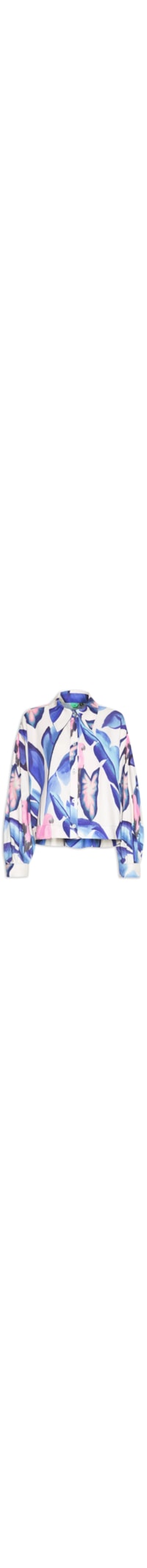 A camisa azul é confeccionado em tecido encorpado com superfície texturizada sem elasticidade. A peça solta ao corpo possui colarinho simples, ombros estendidos, mangas longas com abotoamento nos punhos, detalhe de pregas na altura dos ombros e punhos, barra mullet* com fendas laterais, mix de estampas em cores contrastantes e fechamento frontal por botões.