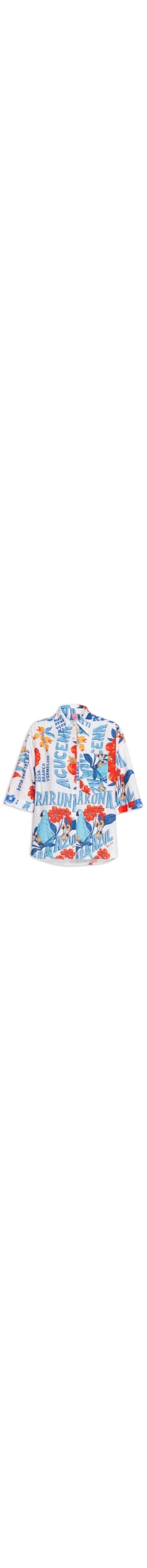 A camisa azul é confeccionada em linho misto sem elasticidade. A peça solta ao corpo possui colarinho clássico, ombros estendidos, mangas 3/4 com detalhe de abotoamento, recorte posterior, mix de estampas em cores contrastantes, leve transparência, barra mullet* arredondada e fechamento frontal por botões.