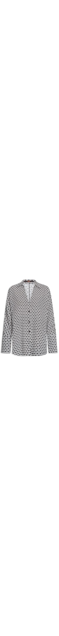 A camisa preta é confeccionada em tecido leve sem elasticidade. A peça solta ao corpo possui colarinho clássico, decote V, mangas longas modelo japonesa com ajuste nos punhos, padronagem de gravataria na cor branca, fendas laterais e barra mullet*.
