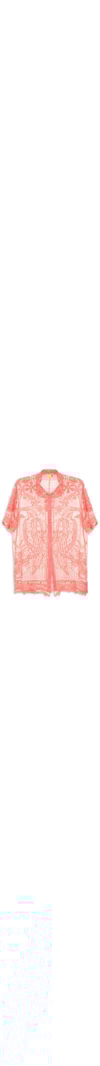 A camisa vermelha é confeccionada em renda. A peça possui colarinho simples, mangas curtas, ombros estendidos, transperência, comprimento alongado, shape solto e fechamento frontal por botões.