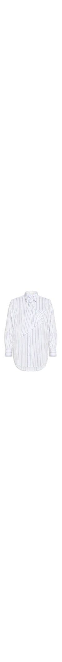 A camisa branca é confeccionada em tecido leve sem elasticidade. A peça solta ao corpo possui colarinho clássico, mangas longas com abotoamento nos punhos, ombros levemente deslocados, bolso frontal embutido, detalhe de faixa alongada aplicada na parte frontal para amarração, recorte posterior, padronagem listrada em cores contrastantes e fechamento frontal por botões.