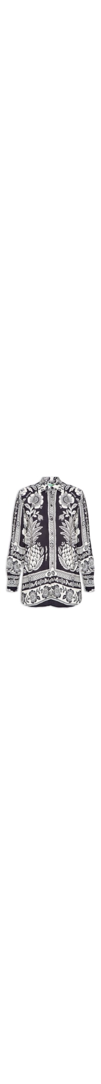 A camisa preta é confeccionada em tecido leve sem elasticidade. A peça solta ao corpo possui colarinho simples, mangas longas com detalhes de franzidos e abotoamento nos punhos, detalhe posterior de pregas, estampa floral em cor contrastante, barra arredondada e fechamento frontal por botões.
