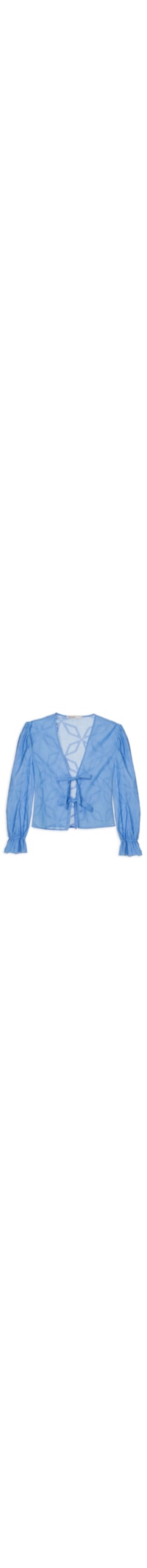 A camisa azul é confeccionada em laise sem elasticidade. A peça solta ao corpo, possui decote em V profundo, mangas longas de modelo poeta com elástico embutido nos punhos, franzido nos ombros, fenda frontal, leve transparência e fechamento frontal por amarração dupla.