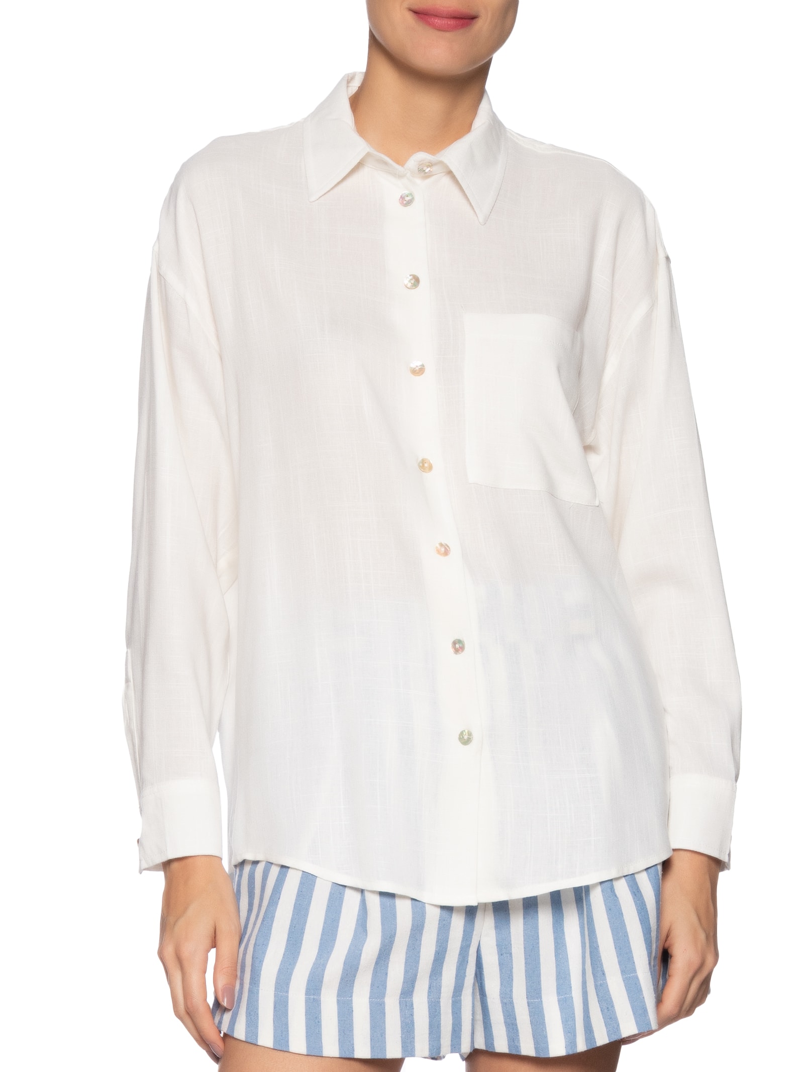 A camisa branca é confeccionada em tecido leve com toque linho sem elasticidade. A peça solta ao corpo possui colarinho simples, mangas longas com abotoamento nos punhos, recorte posterior, bolso frontal na altura do busto, barra arredondada e fechamento frontal por botões.