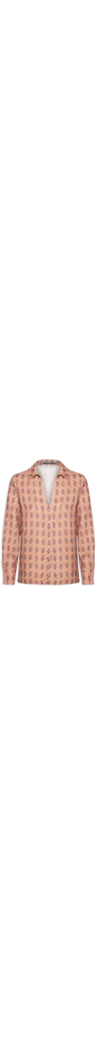 A camisa rosa é confeccionada em linho sem elasticidade. A peça solta ao corpo possui colarinho clássico com recorte em V, mangas longas com ajuste nos punhos, pequenas fendas laterais, estampa figurativa em cores contrastantes e fechamento frontal por botões.