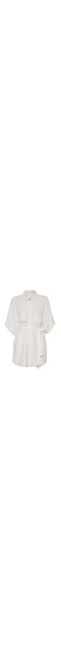 A camisa off white é confeccionada em tecido leve com toque de linho. A peça possui colarinho simples, mangas curtas, bolsos frontais decorativos com aba sobreposta e botão, fendas laterais, barra mullet arredonda, comprimento alongado, shape solto, caimento reto, acabamento pespontado e fechamento frontal por botões com vista sobreposta. Acompanha cinto em trama com aplicação de esferas metalizadas nas pontas para uso opcional.