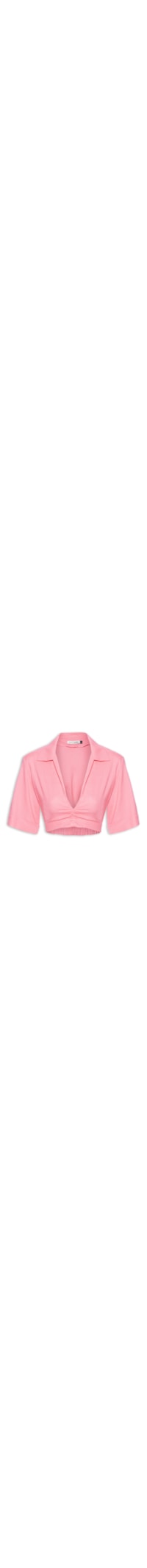 A camisa rosa é confeccionada por tecido leve com toque em linho sem elasticidade. A peça solta ao corpo possui colarinho simples e decote V, mangas curtas com acabamento dobrado, cavas e ombros estendidos, detalhe franzido na parte frontal, tag da marca metalizada aplicada na parte posterior, elástico embutido na barra e comprimento cropped*.