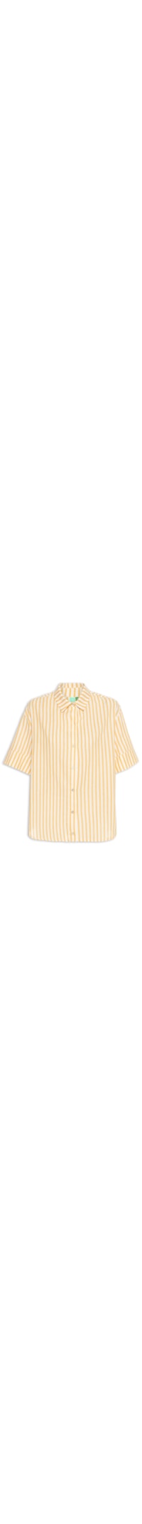 A camisa amarela é confeccionado em tecido leve sem elasticidade. A peça solta ao corpo possui colarinho clássico, mangas curtas, padronagem de listras na cor branca, prega posterior, barra arredondada e fechamento frontal por botões.