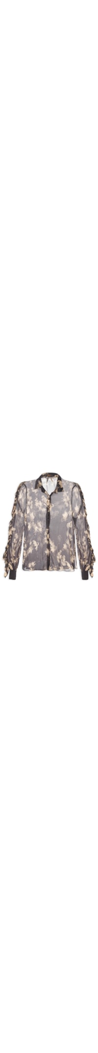 A camisa preta é confeccionada em tecido leve sem elasticidade. A peça solta ao corpo possui gola clássica, mangas longas, ombros levemente deslocados com detalhe franzido, babados aplicados ao longo das cavas e extensão das mangas, leve transparência, estampa floral em cores contrastantes e fechamento frontal por botões.