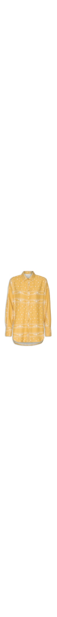 A camisa laranja é confeccionada em crepe sem elasticidade. A peça solta ao corpo possui colarinho clássico, ombros estendidos, mangas longas com abotoamento nos punhos, recorte posterior, fendas laterais com detalhe de recorte, estampa abstrata em tom contrastante, barra mullet*, comprimento alongado e fechamento frontal em botões.
